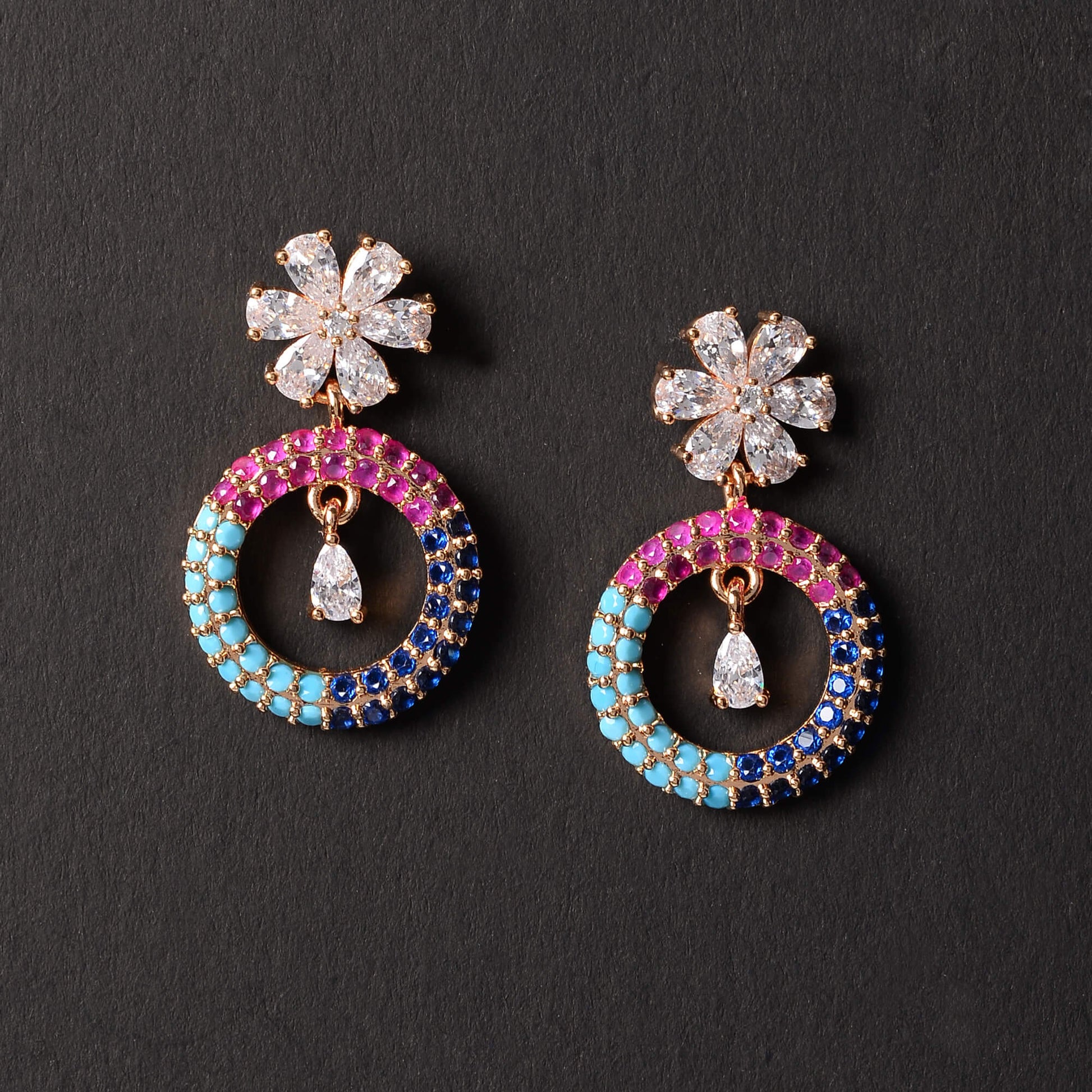 Celestyn is a vibrant expression of elegance and colour. Designed with beautifully arranged multicolor zirconia stones, these dangler earrings add depth, movement, and refined sparkle to your look. The balanced silhouette ensures the colours stand out gracefully without feeling overwhelming, making them a statement piece with a polished finish.