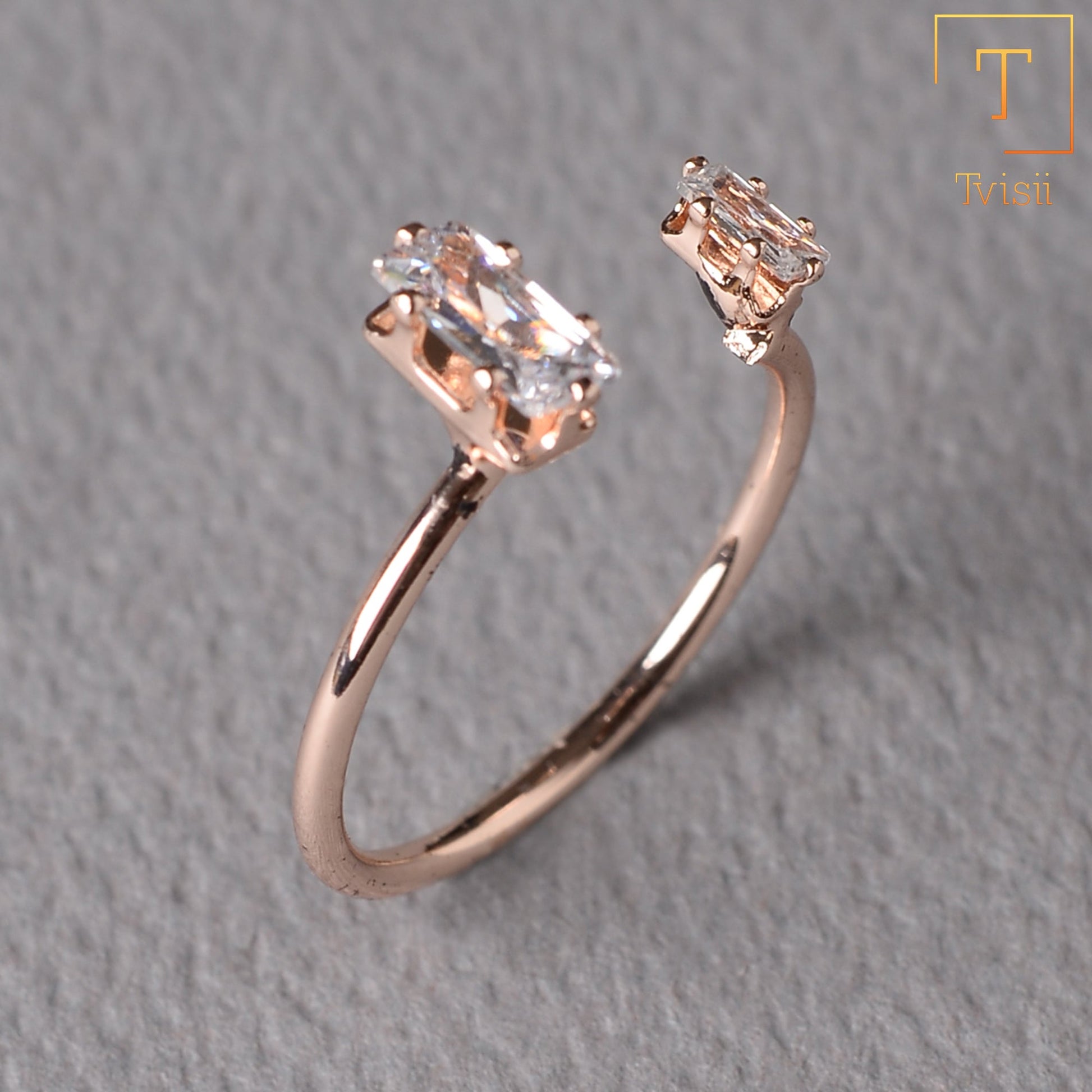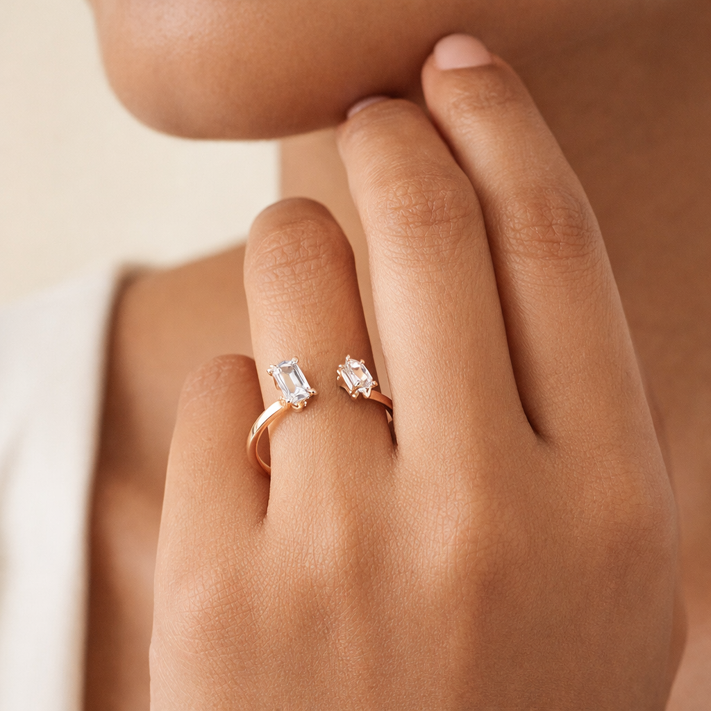 The Astrisia Stone-Studded Rectangular Fancy Ring in a rose gold finish brings a modern edge to contemporary jewellery styling. Featuring a sleek rectangular silhouette with subtle stone detailing, this ring strikes the perfect balance between elegance and statement design. Lightweight and refined, it’s ideal for party wear and elevated evening looks.